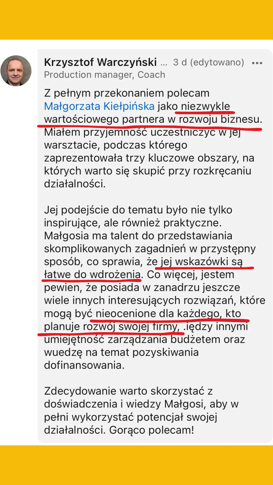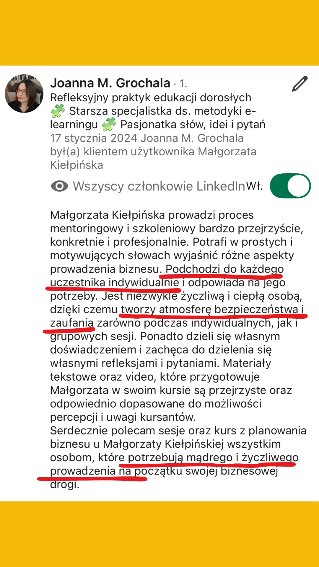 Wszystkie recenzje zamieszczone na tej stronie pochodzą od rzeczywistych klientów. Wyniki przedstawione tutaj nie są standardowe i nie stanowią gwarancji podobnych rezultatów. Indywidualne osiągnięcia mogą się różnić w zależności od Twoich zdolności, doświadczenia, zaangażowania oraz nieprzewidzianych czynników. Firma nie przeprowadziła jeszcze analiz dotyczących wyników swoich typowych klientów, dlatego Twoje rezultaty mogą być odmienne.